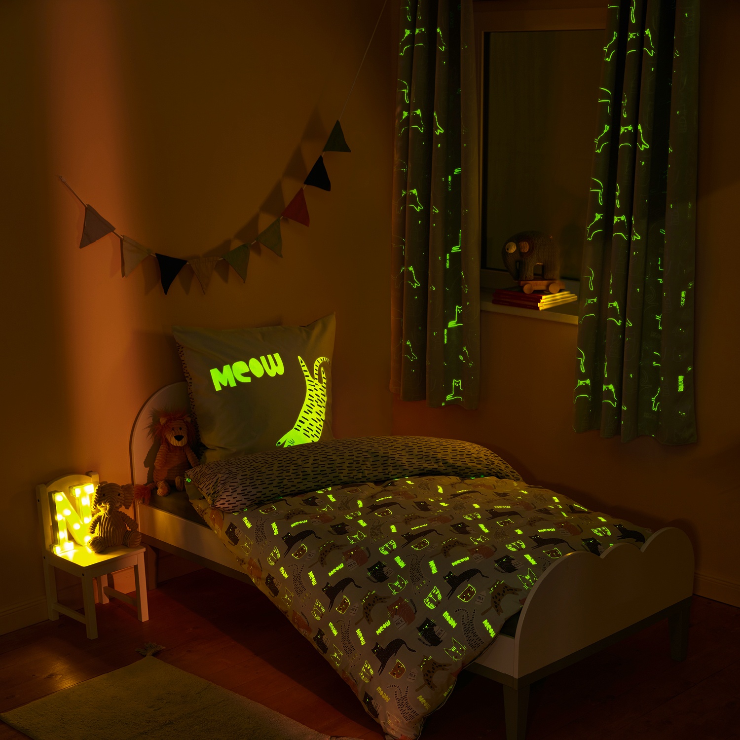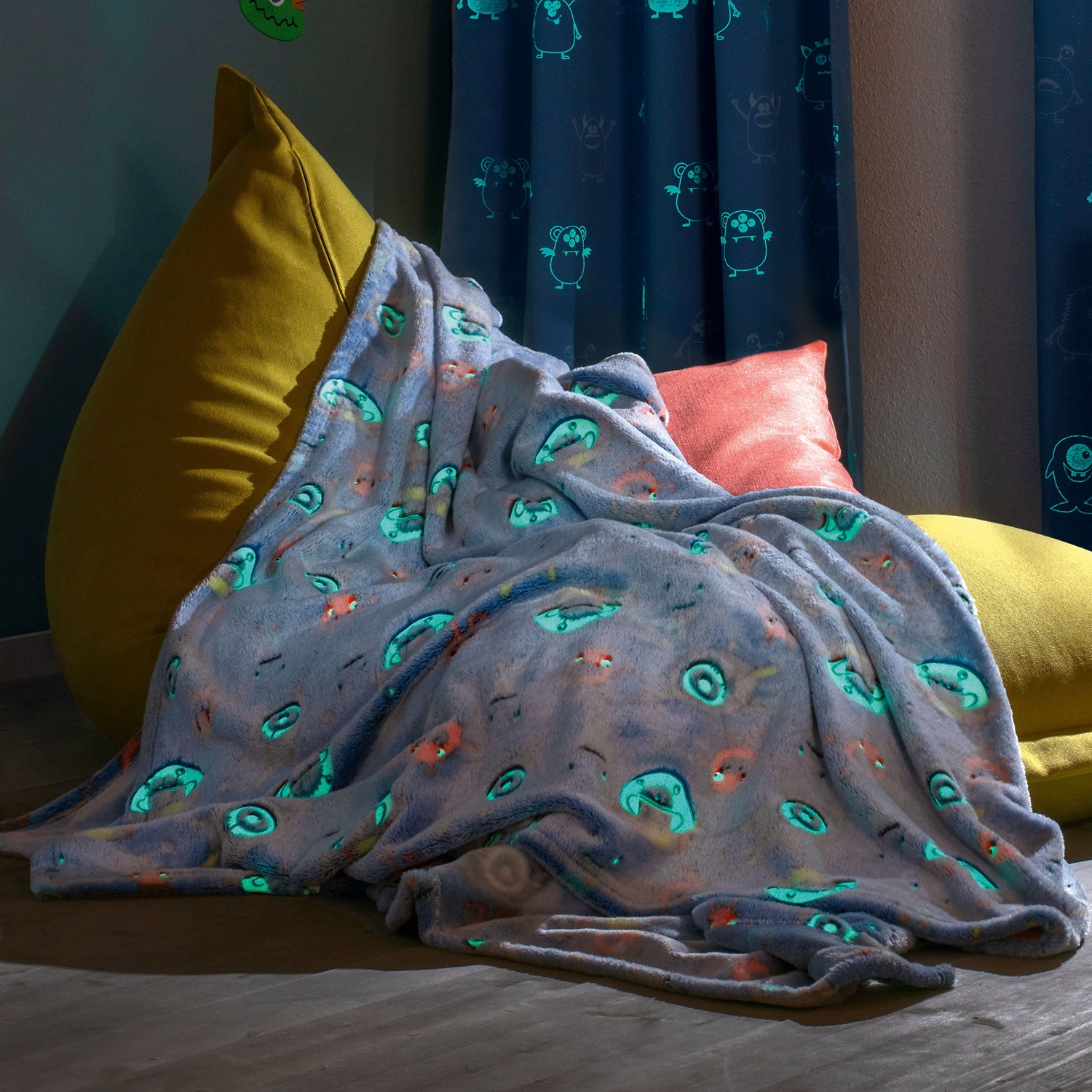 And when the lights go out watch with delight as the monster print glows.