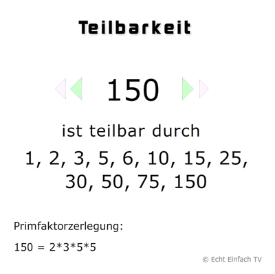 1 2 3 4 6 8 9 12 16 18 24 36 48 72 144 teiler von 150.